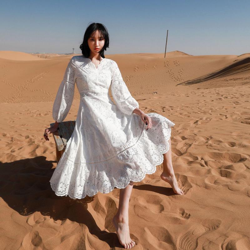 Пляжное платье Санья: Новое стильное белое длинное платье с V-образным вырезом и ажурным кружевом для пустыни или отпуска Medium