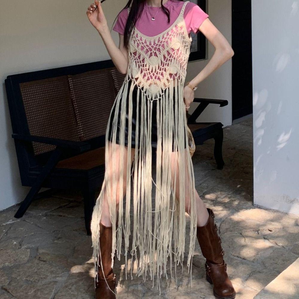 Пляжное платье в стиле бохо с кисточками из полиэстерового волокна, элегантное трикотажное платье для вечеринки у бассейна абрикосовый