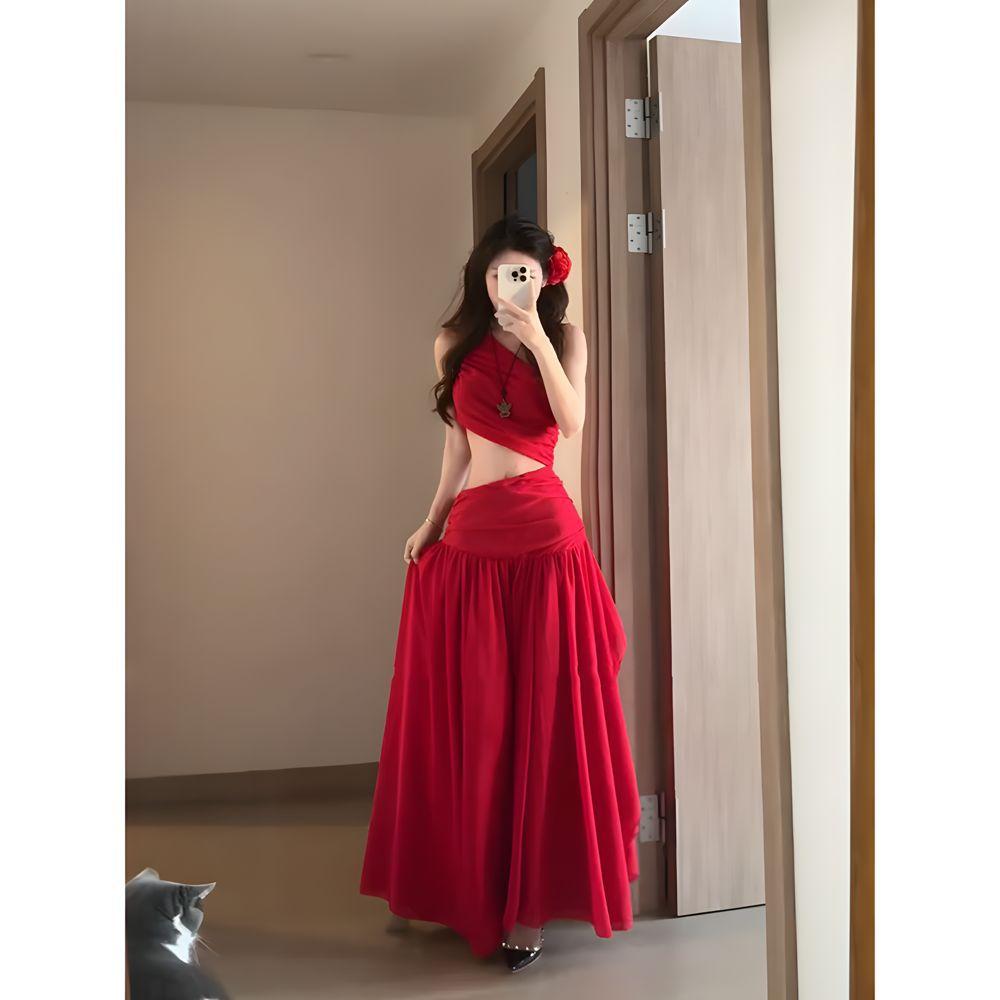 Пляжное платье для отпуска на море, женское летнее платье с темпераментом, с завышенной талией, на одно плечо, с разрезом, длинное женское платье XL- (Recommended 110-60kg)