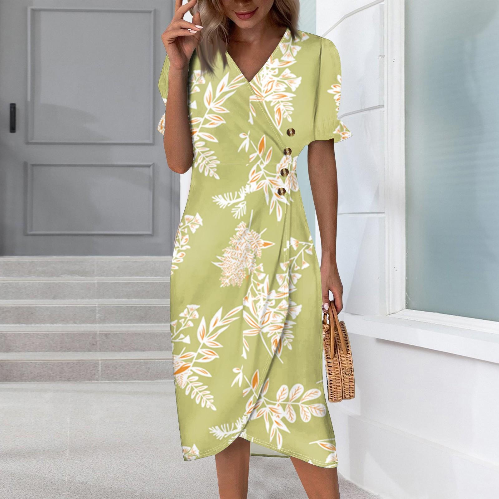 Пляжные платья для женщин, весна-лето, элегантное платье с V-образным вырезом и цветочным принтом в стиле бохо, струящееся гавайское платье макси с рюшами M жёлтый