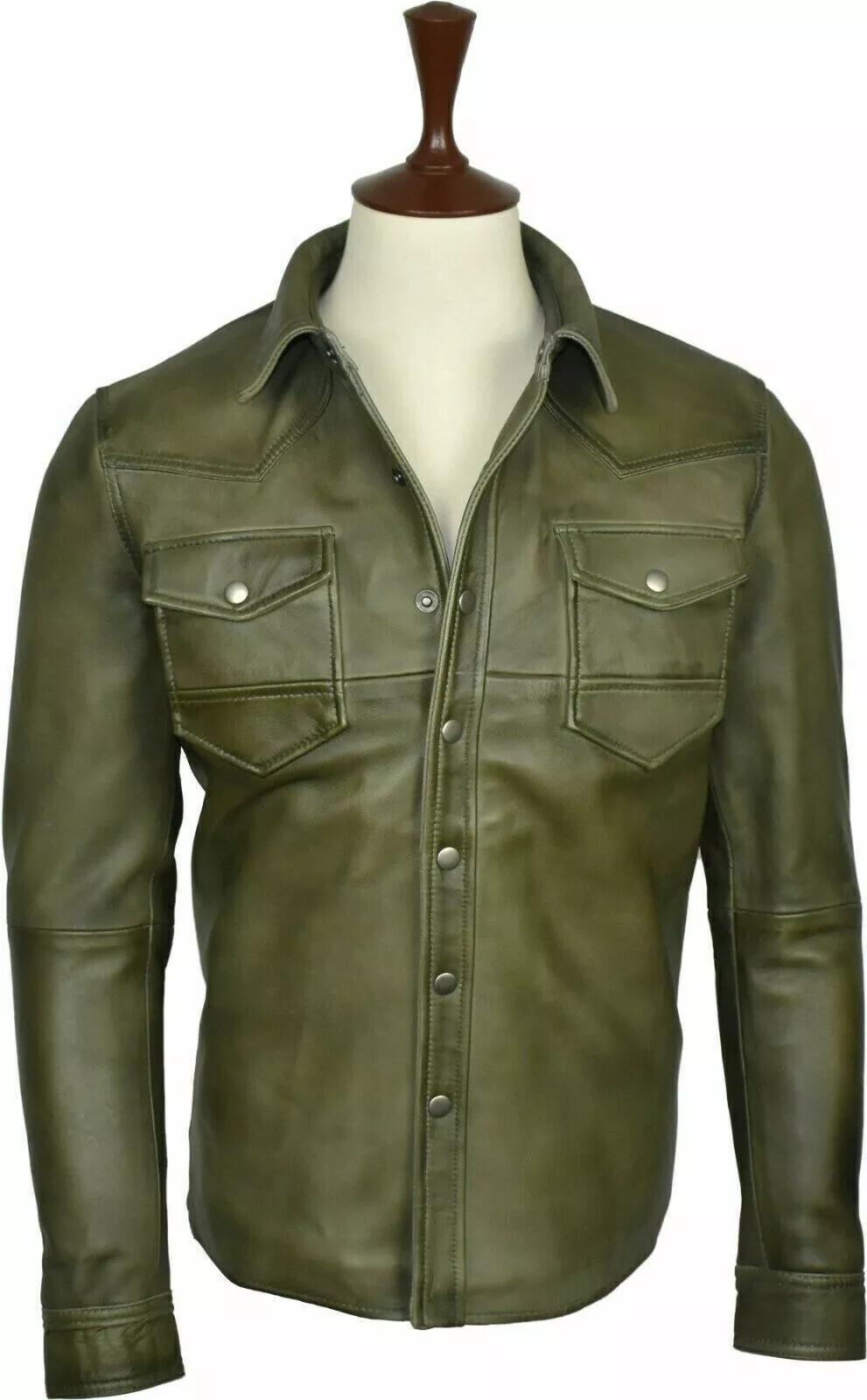 Повседневная Формальная Классическая Мужская Рубашка Зеленая Натуральная Кожа Ягненка Стильная Ручной Работы 3XL зелёный