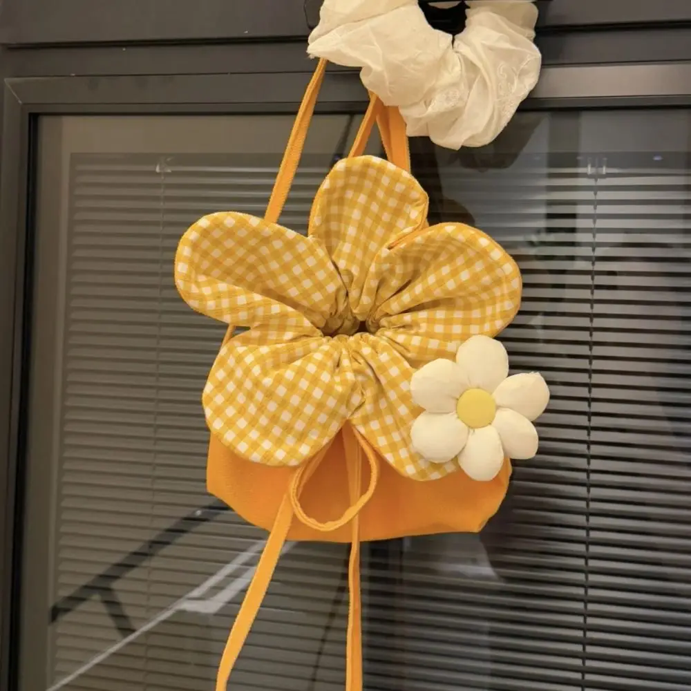 Повседневная клетчатая сумка на шнурке с цветком, милая тканевая маленькая сумка через плечо, портативная сумка для хранения, женская сумка на плечо