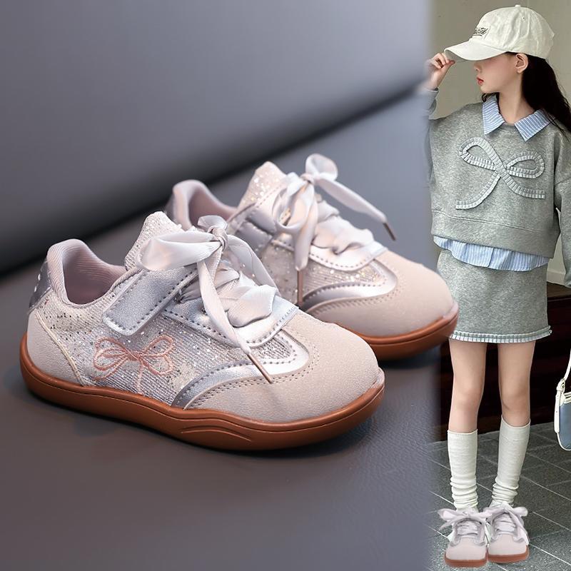 Повседневная обувь для девочек, мягкая подошва, застежка-липучка, детские туфли принцессы, милые ленты, новая детская обувь на плоской подошве 2025, круглый носок, милые банты 23 серебряный