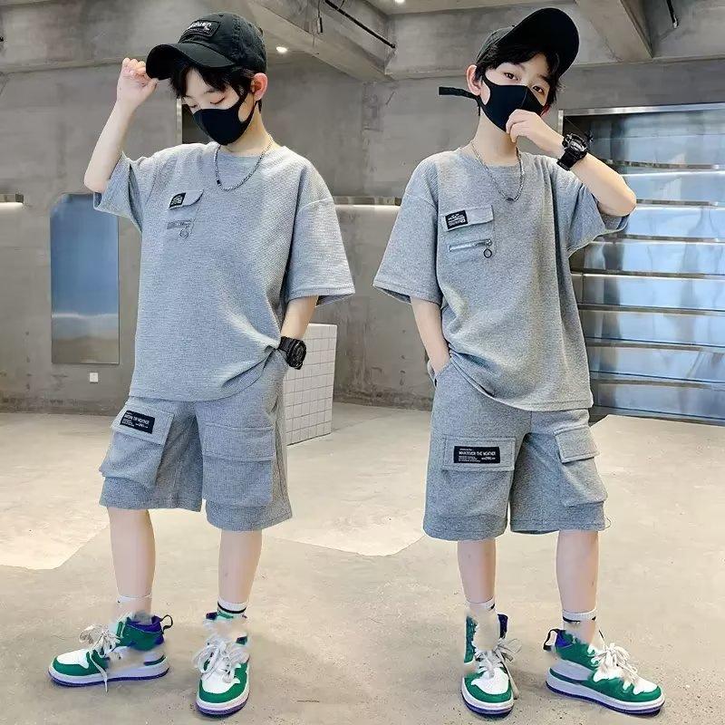 Повседневная спортивная одежда для мальчиков, летние шорты с короткими рукавами + шорты с несколькими карманами, комплект из двух предметов