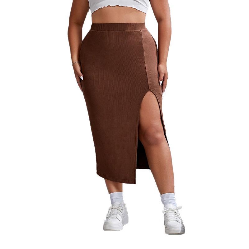 Повседневная эластичная юбка с высокой талией, однотонная юбка с боковым разрезом, трикотажная облегающая юбка в рубчик, облегающая юбка больших размеров, женская модная юбка для пригородных поездок 3XL темно-коричневого
