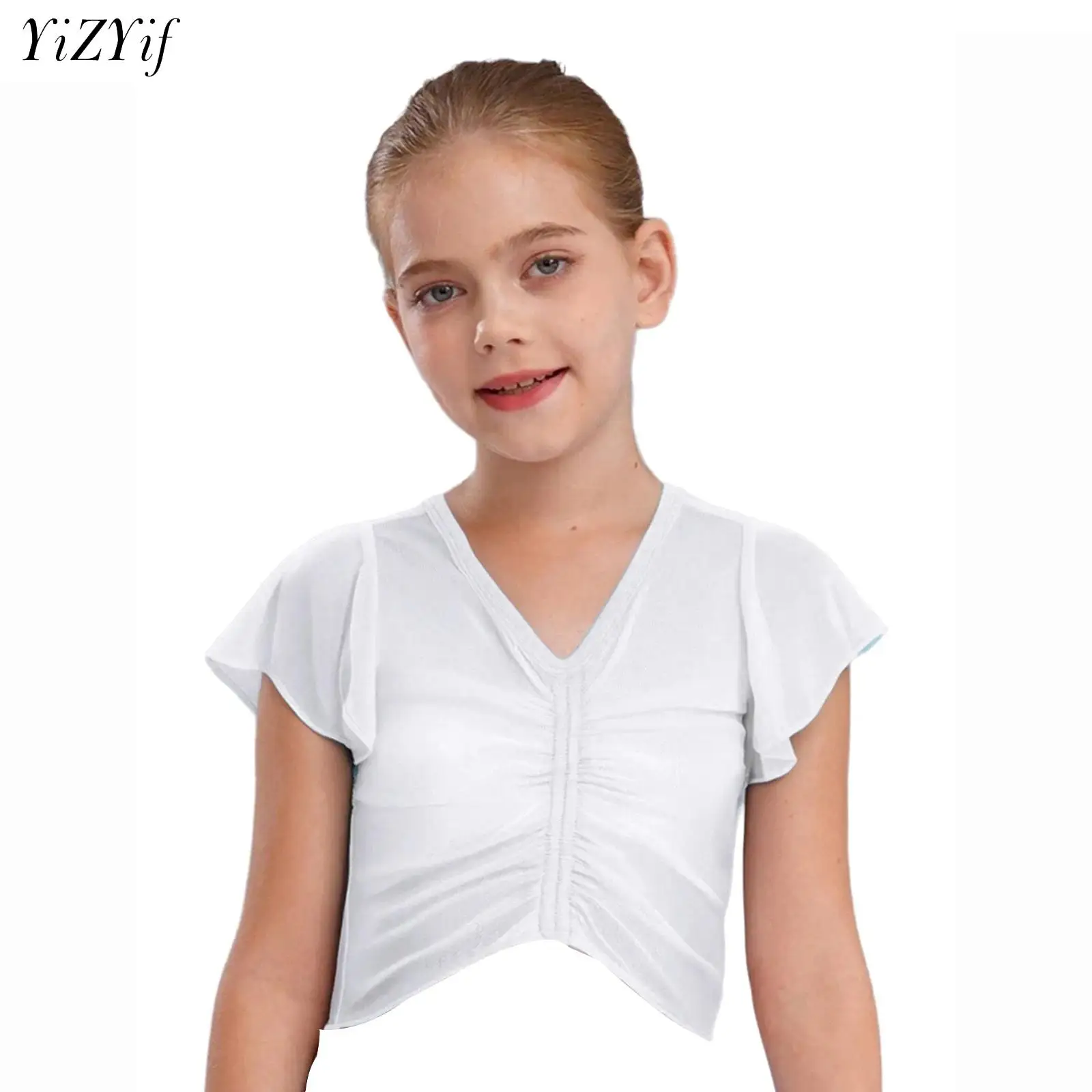 Kid Girls Nylon Ballet Dance Top with Chest Ruched Sheer Mesh Ruffled Sleeves Tops Children Classic Dance Practice Costumes