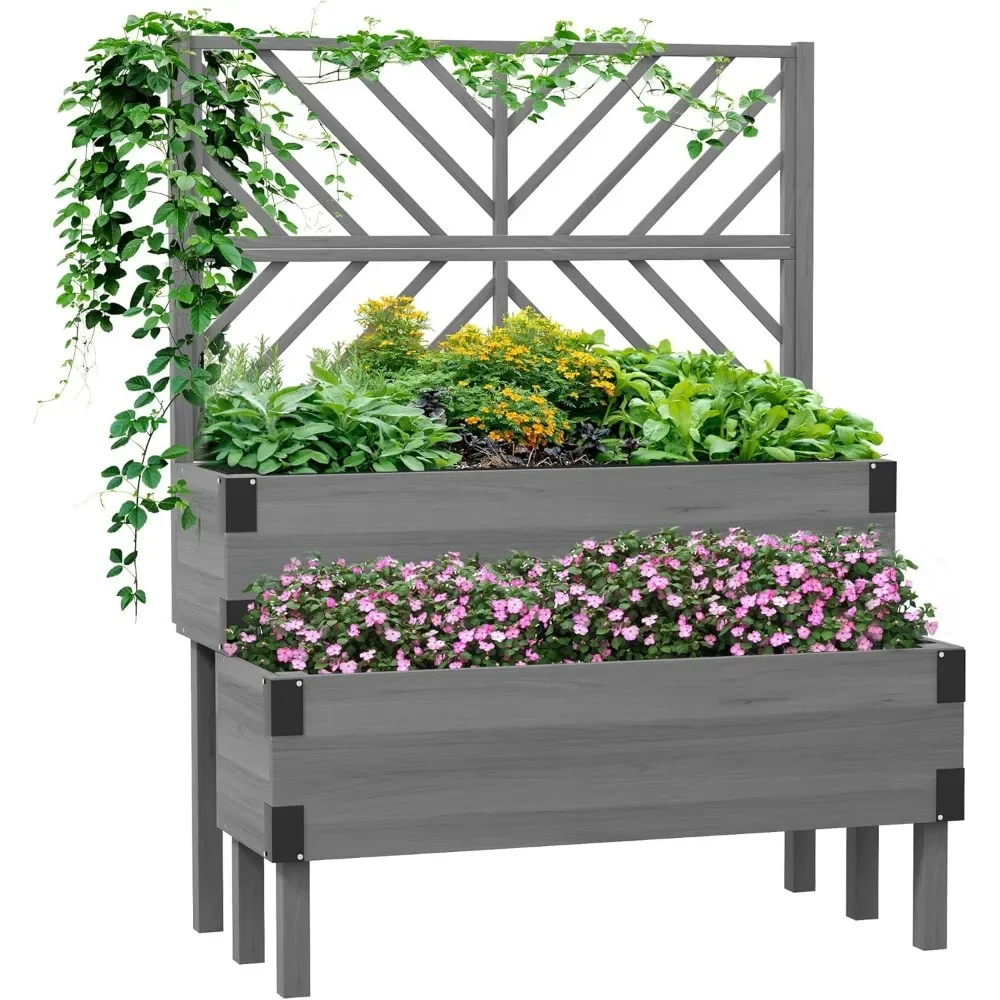 Поднятая садовая кровать с решеткой, 2-х ярусная деревянная приподнятая кашпо с ножками и металлическими углами для овощей, цветов,