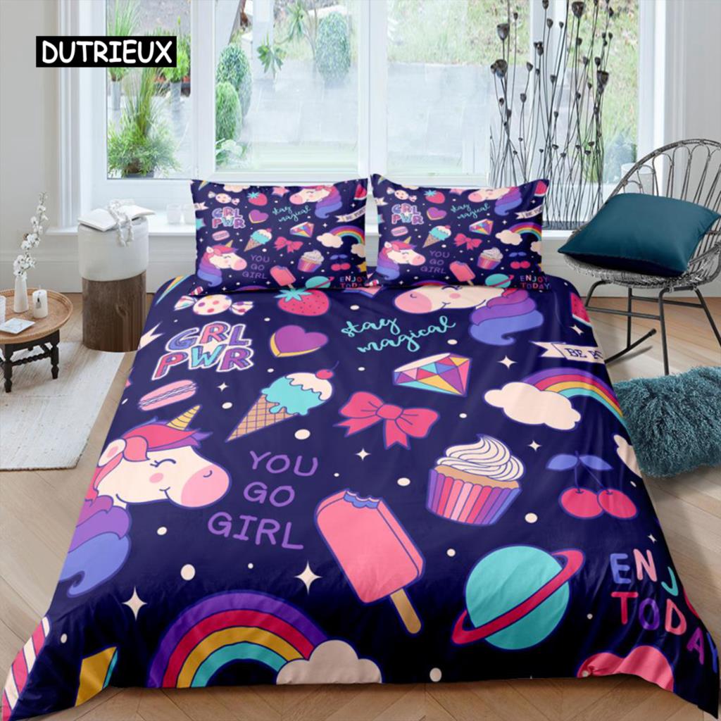 Пододеяльник розовый радужный единорог комплект одеяла для женщин девочек детей на день рождения украшение спальни милый мультяшный зверек EU single(135x200cm)