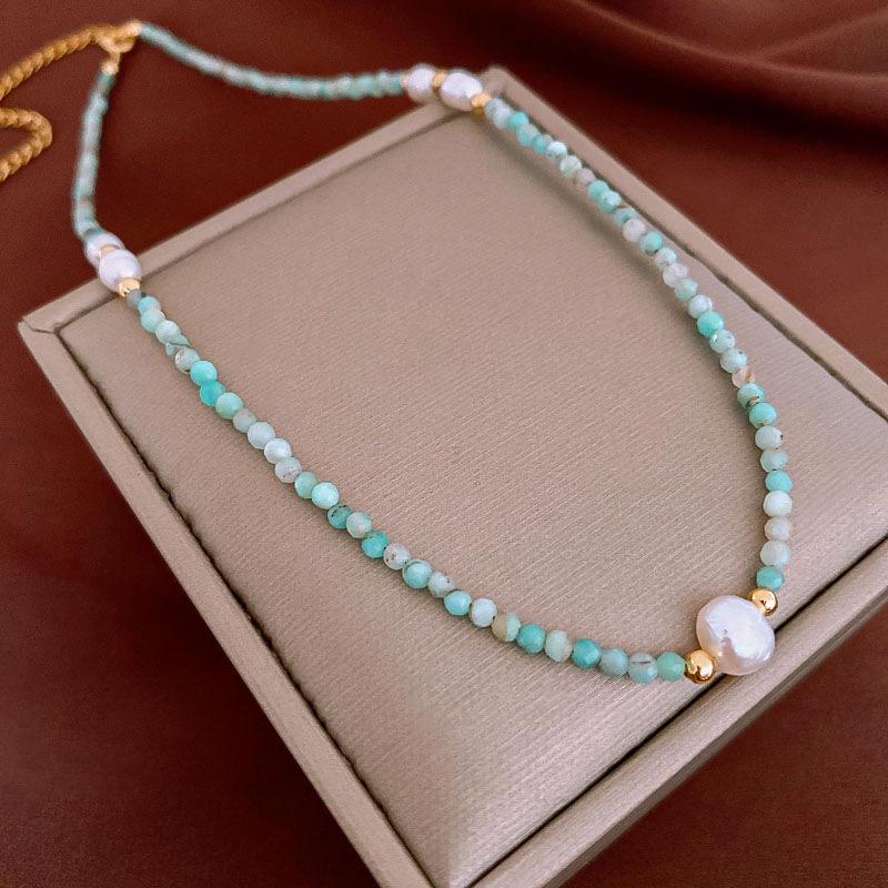 Позолоченное колье из амазонита и жемчуга - Элегантная простая цепочка для ключицы, Универсальное украшение высокого класса