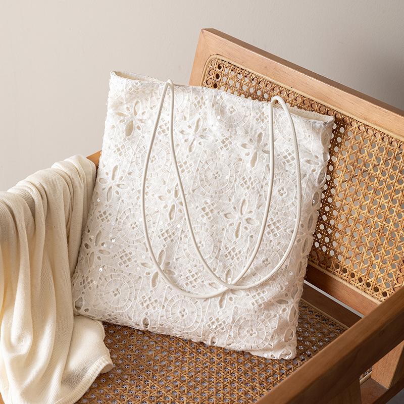 Полая вышивка кружевом наплечная сумка с цветочным дизайном, большая вместимость, сумка-тоут с пайетками, легкая женская сумка-шоппер, KTY 34x36cm белый