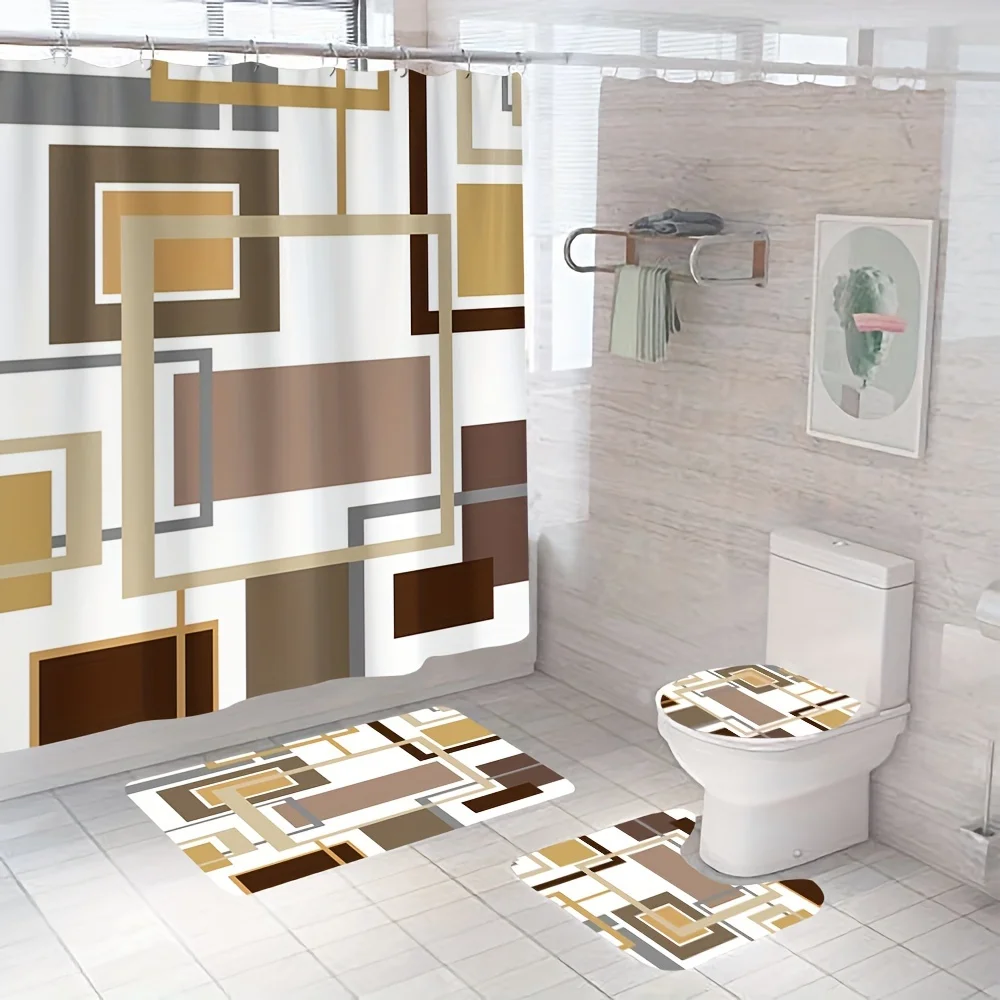 Набор из 4 предметов, стильная занавеска для душа с геометрическим узором и крючками, набор для ванной комнаты, нескользящий ковер, коврик для ванной комнаты, сиденье для унитаза