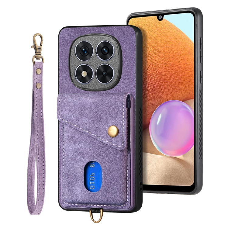 For Xiaomi Redmi Note 14 Pro+ 5G Retro Card Wallet Fold Leather Phone Case with Strap(Purple)