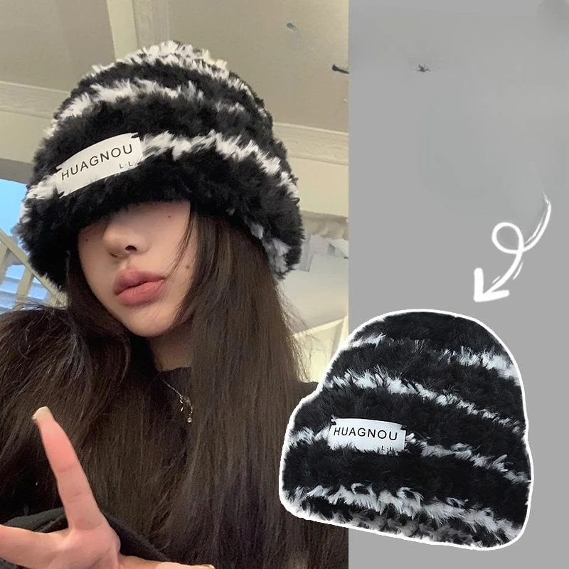 Полосатая вязаная плюшевая шапка для женского зимнего тепло, защита ушей, универсальная большая голова, маленькая лицо и толстая плюшевая шапка