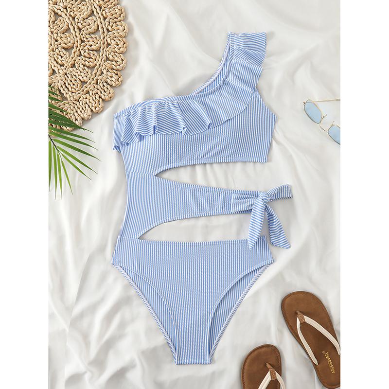 Полосатый слитный купальник женский с косым плечом, с оборками, купальный костюм с вырезами на шнуровке, летняя пляжная одежда L синий