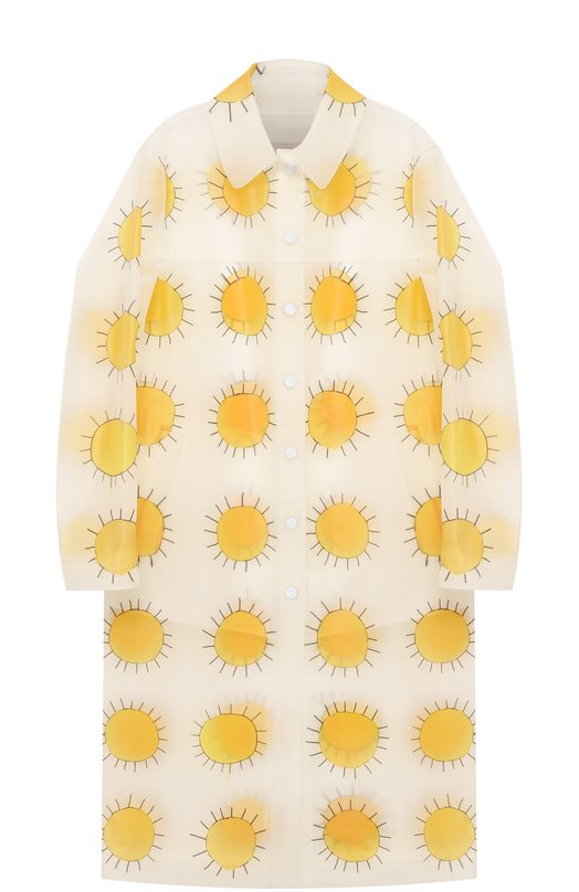 Белое пальто с отложным воротником и длинными рукавами изготовлено из прорезиненного непромокаемого материала с желтым паттерном из солнц (такой мотив добавит ярких красок пасмурному дню). Легкая полупрозрачная модель не мнется, ее можно хранить сложенной в сумке. Изделие из осенне-зимней коллекции застегивается на кнопки.
