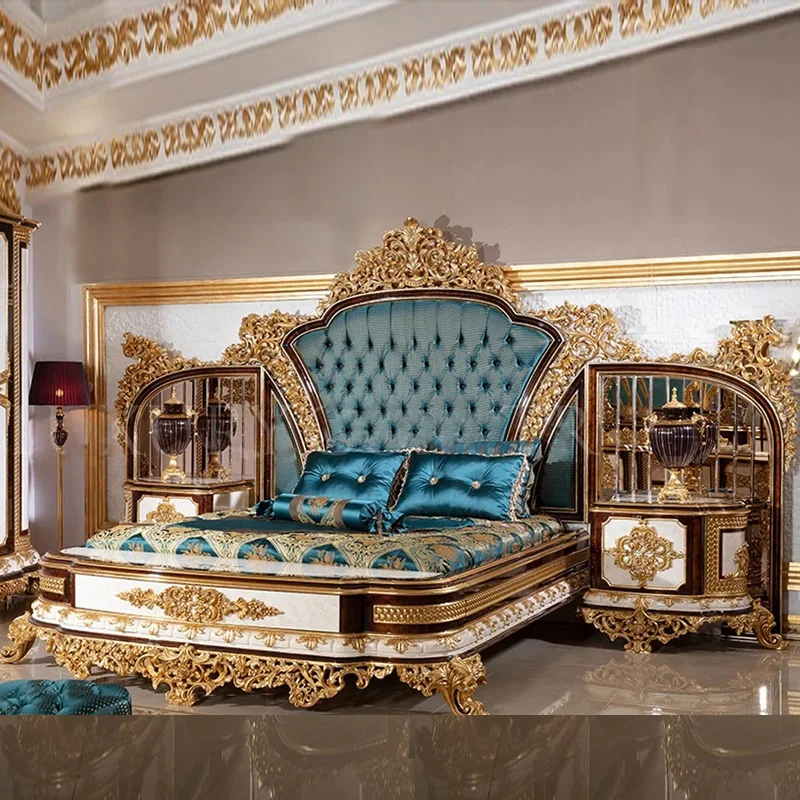 Пользовательская Европейская кровать из цельной древесины, Роскошная ткань, Золотая фольга, французская Корта, деревянная резная двойная кровать принцессы