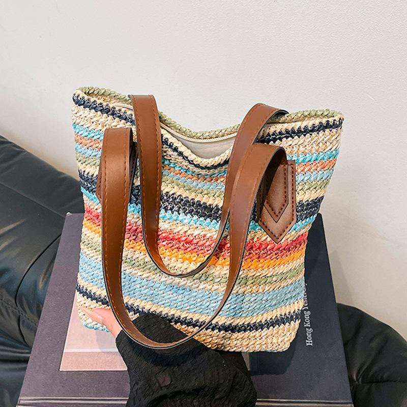 Популярная плетеная сумка с радужными контрастными полосками, повседневная, большой вместимости, на плечо, пляжная сумка, универсальная модная сумка для отпуска оранжевый
