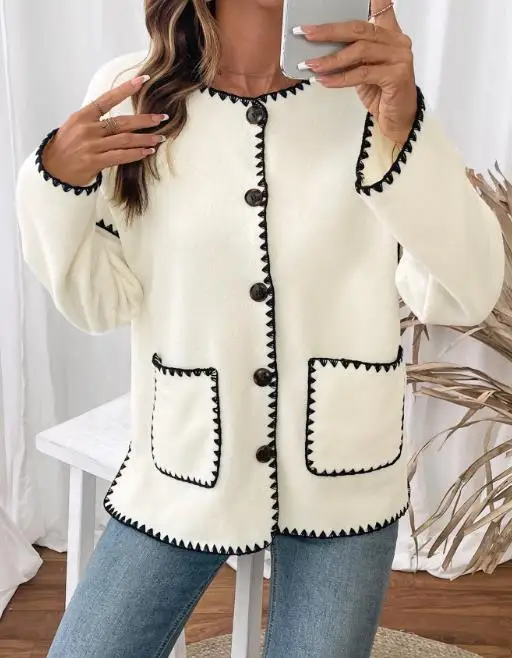 Популярные товары для поездок на работу и отдых на осень и зиму 2023 года, женская свободная белая шерстяная куртка с отделкой.