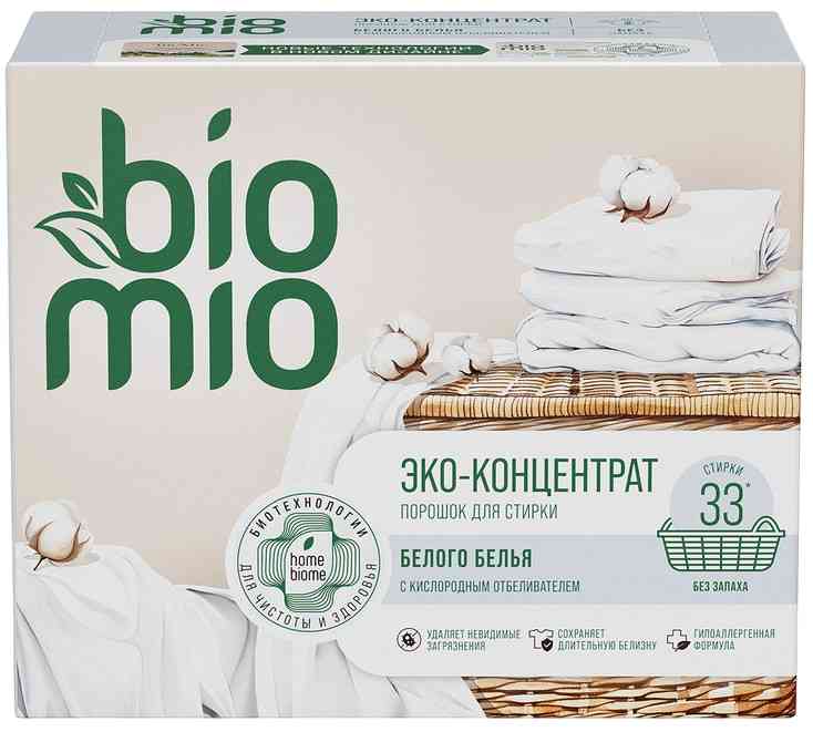 Экологичный концентрированный порошок BioMio® для стирки белого белья с кислородным отбеливателем благодаря биотехнологиям Homebiome® удаляет невидимые загрязнения, сохраняет длительную белизну и форму тканей. Гипоаллергенная формула. Экономичный расход - достаточно одной ложки на стирку в мягкой воде.