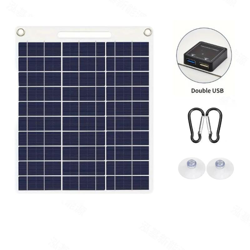 Портативная гибкая поликристаллическая солнечная панель с двумя USB-портами для высокоэффективной зарядки мобильных устройств.