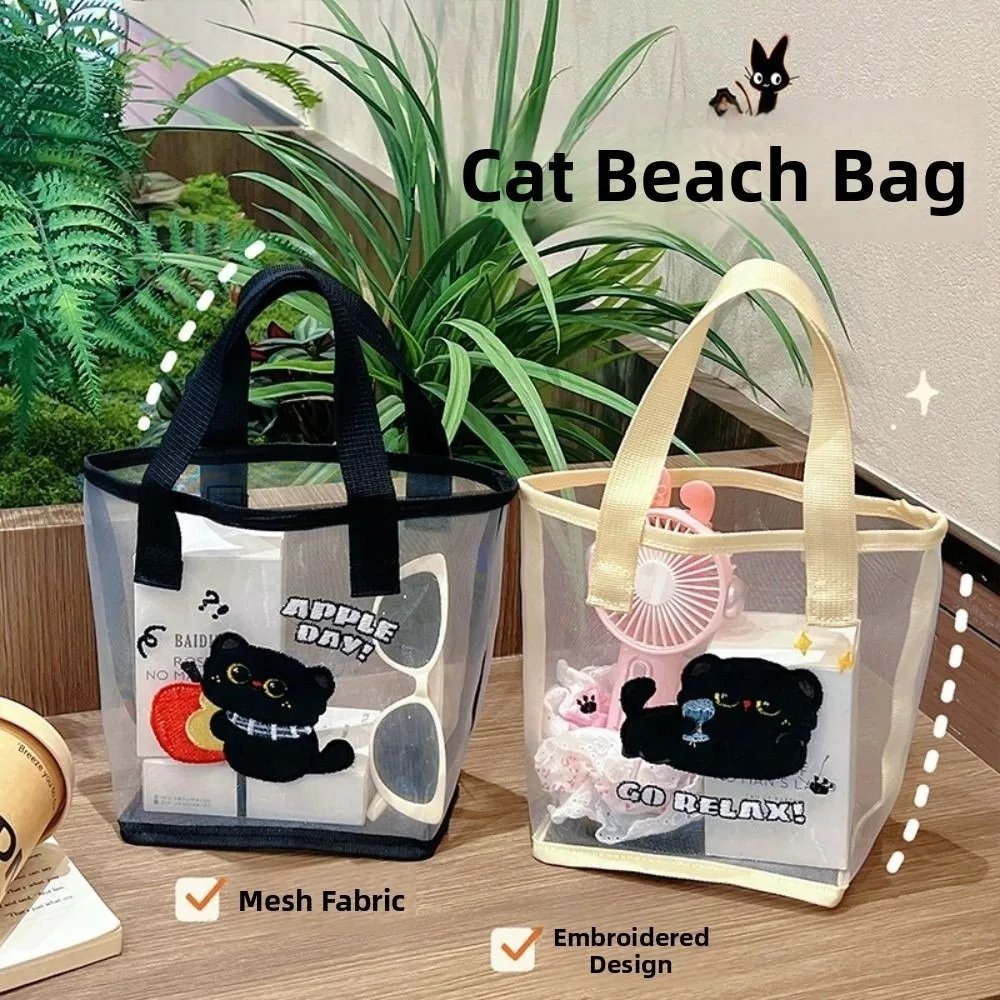 Портативная сетчатая сумка с маленьким черным котом, прозрачная уличная сумка для хранения с героями мультфильмов, большая вместительная сумка для покупок, пляжные путешествия
