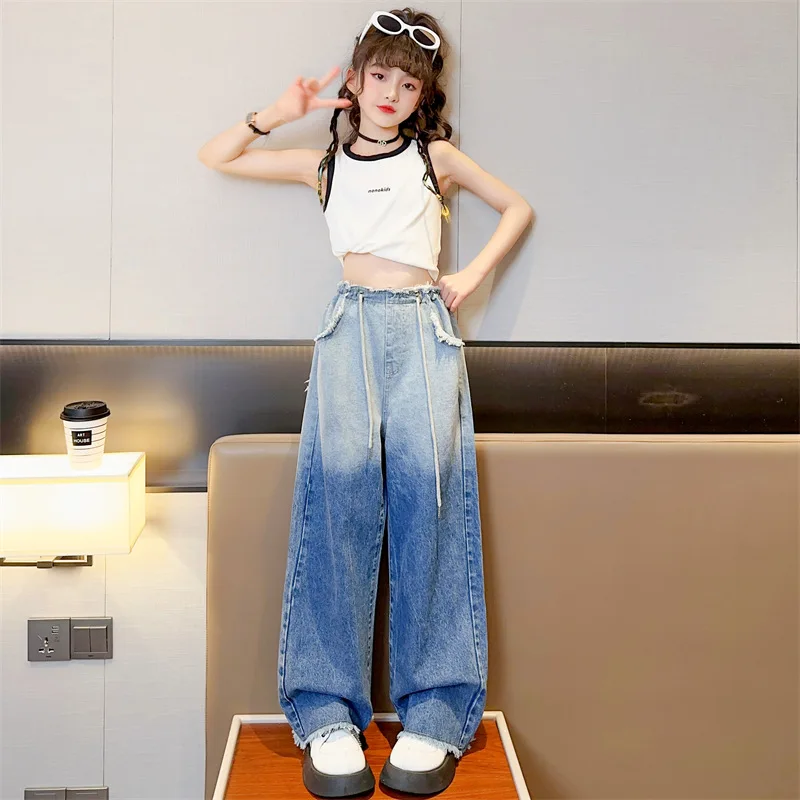Джинсы для девочек, джинсовые брюки, молодежные брюки с широкими штанинами для девочек, Размер 12, 14, синие, на весну, осень, лето, одежда для девочек-подростков