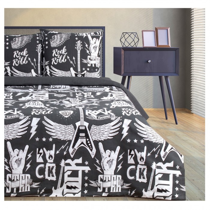 Этель Постельное бельё Евро бязь Rock&Roll наволочки 70x70 см (4 предмета) Для нанесения рисунков использовались качественные европейские красители. Именно поэтому цвета надолго останутся яркими и насыщенными, а аллергия и раздражения пройдут мимо. Простыня без поперечного шва! Все внутренние швы дополнительно обработаны оверлоком, чтобы избежать естественного осыпания края. Вход в пододеяльник и наволочки оформлен клапаном, простыня без резинки. Особенности: Состав ткани: 100% хлопок. Плотность ткани составляет 125 г/кв.м. Рекомендации по уходу: барабанная сушка при низкой температуре, бережный режим глажки, деликатная стирка при 40 °С, не отбеливать. Комплектация: простыня 220x240; 2 наволочки 70x70; пододеяльник 200x217.