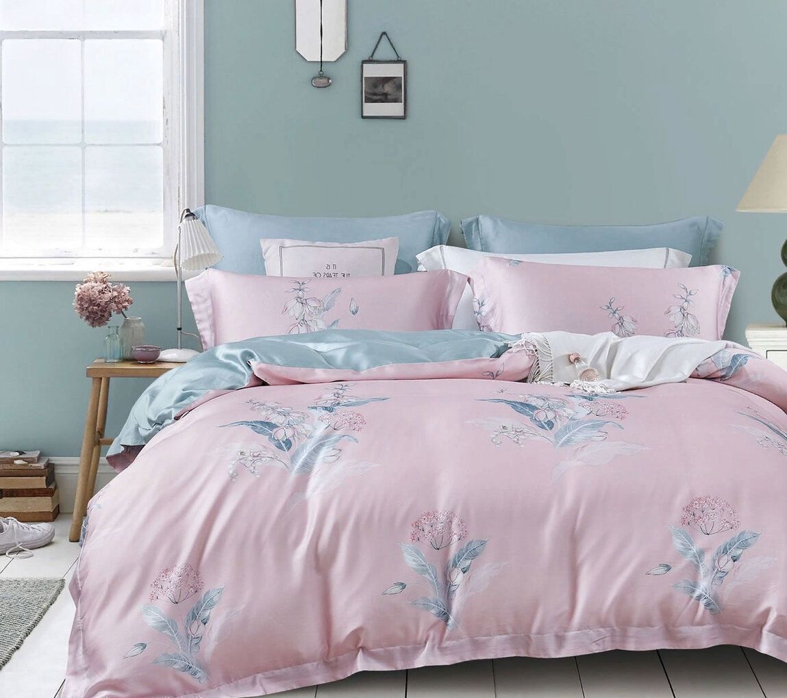 Ткань состоит из основы + компаньон. Основа (А) - светло-розового цвета с принтом цветов и листочков. Компаньон (В) - светло-голубого-серого цвета.Ткань подобно струящемуся шелку,нежная и приятная как египетский хлопок. Охлаждающая летом словно натуральный лен и уютно согревающий в холода подобно шерсти. Это всё ткань тенсель (лиоцелл) – текстиль последнего поколения,созданный по нанотехнологии.Материал изготавливают из древесины австралийского эвкалипта по экологичной и безотходной технологии.