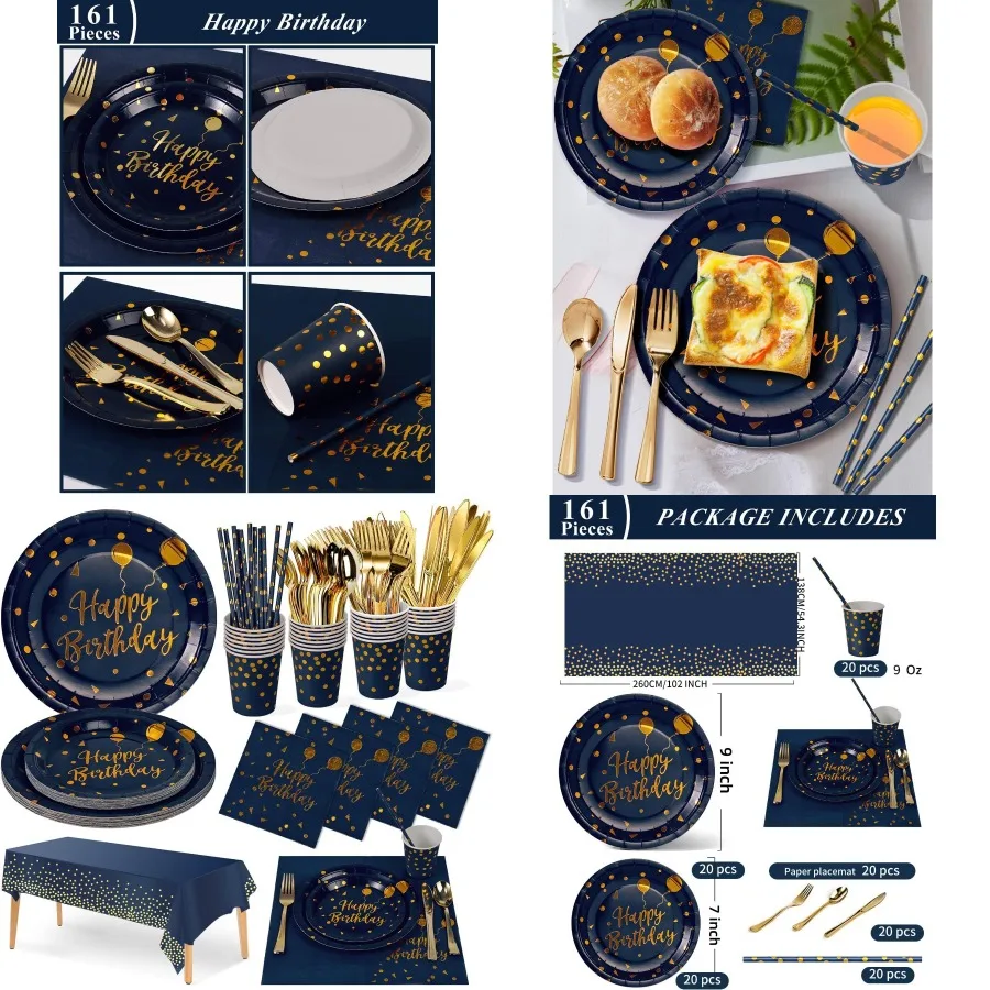 Посуда для дня рождения, 161 шт., темно-синее золото, товары для вечеринок для душа, помолвки, украшения для вечеринок, в комплект входит бумажная тарелка