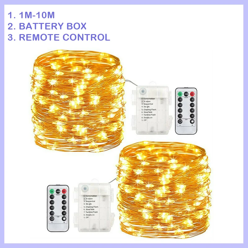 Праздничная уличная медная гирлянда, 1-10 м, 8 режимов, медный кабель с питанием от батареи + пульт дистанционного управления для вечеринки, Ро...
