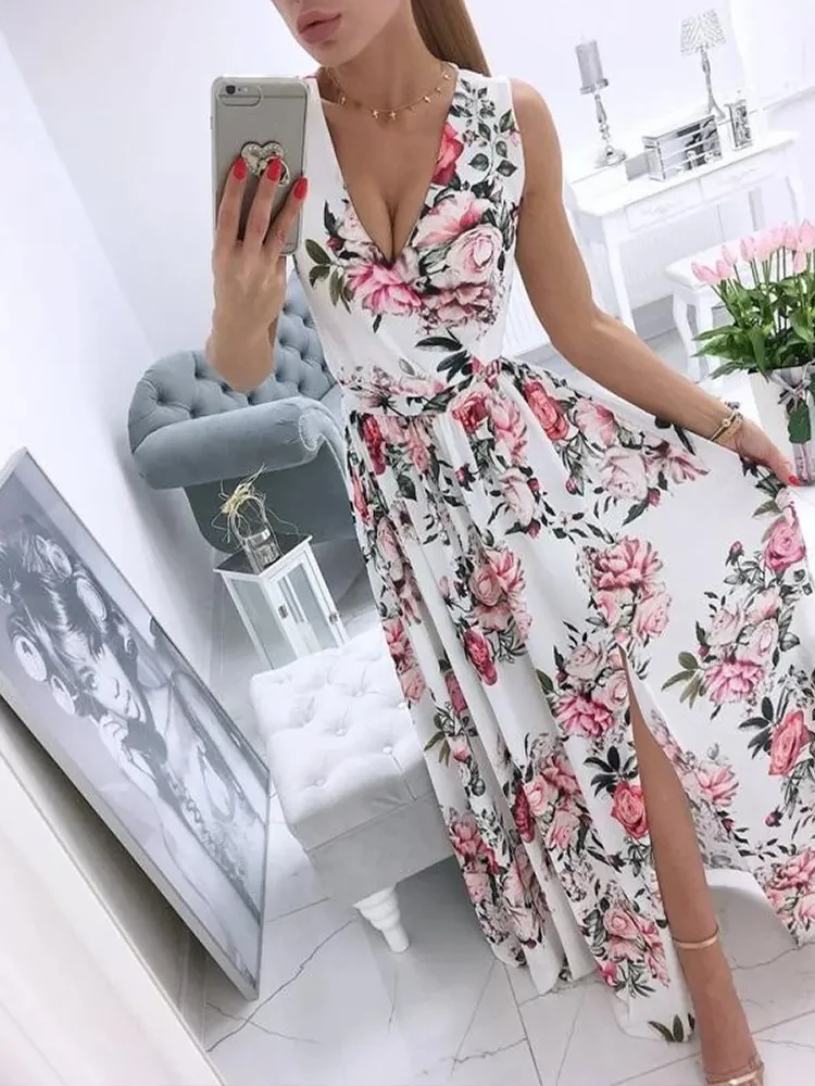 Летние платья Shein Romwe 2022 для женщин с V-образным вырезом и цветочным принтом, платье с высоким разрезом, Vestidos De Mujer, Повседневное платье макси, ...