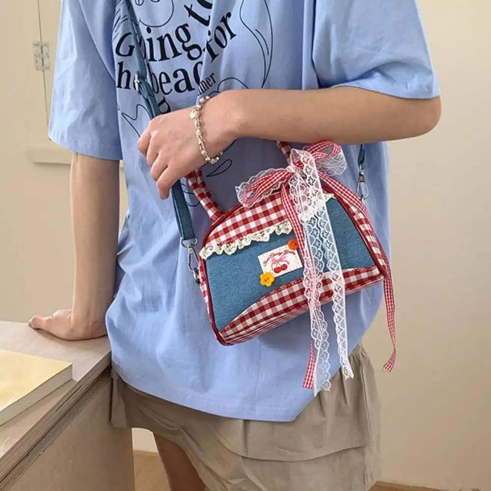 Прекрасная решетчатая сумка для боулинга в стиле ретро, джинсовая клетчатая сумка для отдыха в сельском стиле с бантом, милая сумка через плечо для поездок на работу, уличная сумка