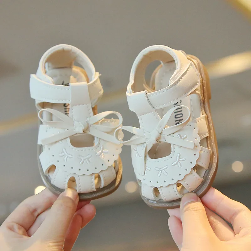 Прогулочная обувь для девочек, простые детские пляжные туфли с Т-образным ремешком и бантиками, нескользящая мягкая подошва, новые летние сандалии 2024, модные модные сандалии для малышей
