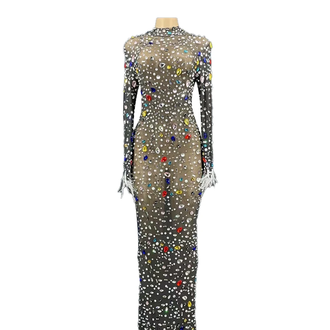 Shining Rhinestone Black Mesh Transparent Evening Long Sleeves Crystals Feather Dress Evening Birthday Celebrate Party Costumes