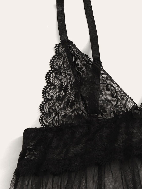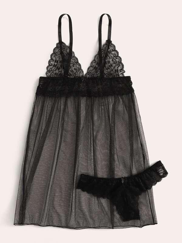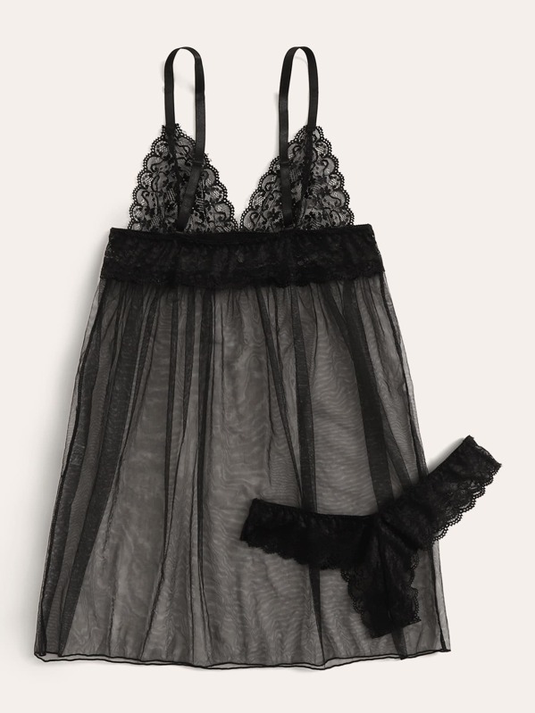 Прозрачная сетчатая ночная рубашка и стринги, Черный