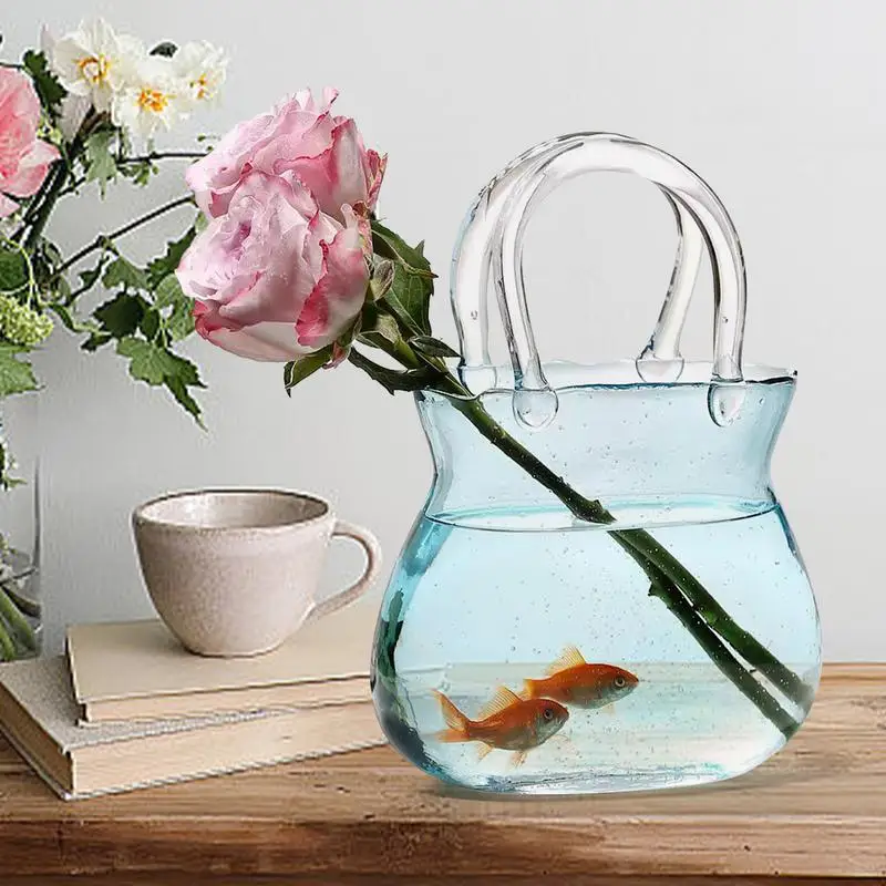 Прозрачная стеклянная ваза, сумка-тоут с рыбками, Цветочная сумочка, сумка, ваза, центральный орнамент для рабочего стола, украшение для интерьера, стеклянный цветочный горшок для офиса
