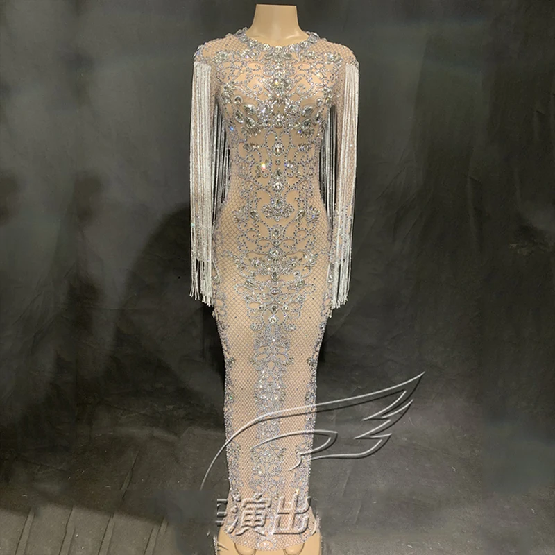 Прозрачное Сетчатое длинное платье с бахромой, прозрачный сценический костюм, женская модель певицы, вечерняя одежда для выпускного вечера...