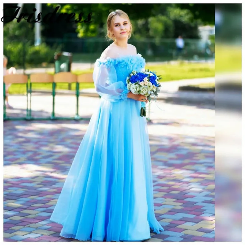 Прозрачное платье для выпускного вечера с круглым вырезом, 2020, мягкое синее официальное импортное вечернее платье с цветами и длинными рука...