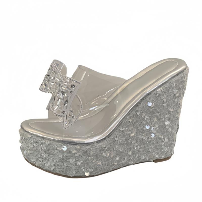 Прозрачные женские шлепанцы на платформе из ПВХ, модные, с кристаллами, стразами и бантом, на высоком каблуке-клине, летняя обувь для вечеринок и платьев 40 серебряный