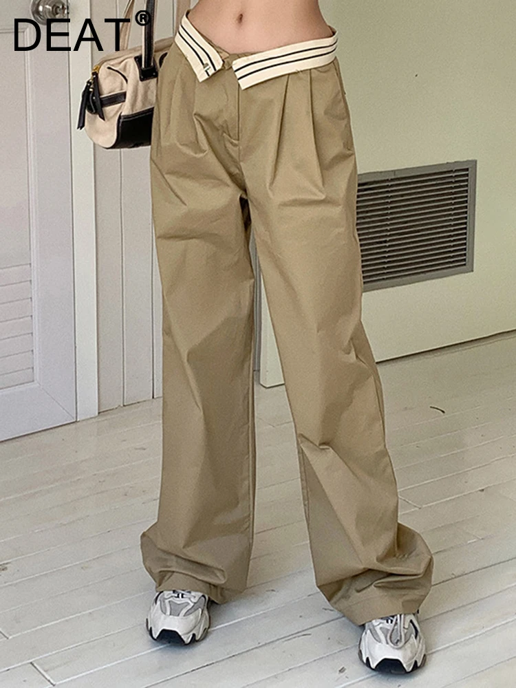 Женские свободные брюки-карго DEAT, прямые однотонные брюки в полоску с широкими штанинами и высокой талией, с поясом, на осень, 17A4982, 2023