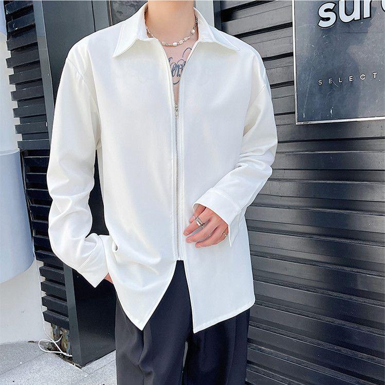 Простота Свободный Однотонный Отложной Воротник Красивый Весна Лето Рубашки с Длинным Рукавом Мужская Одежда Молния Уличная Одежда Повседневный L белый