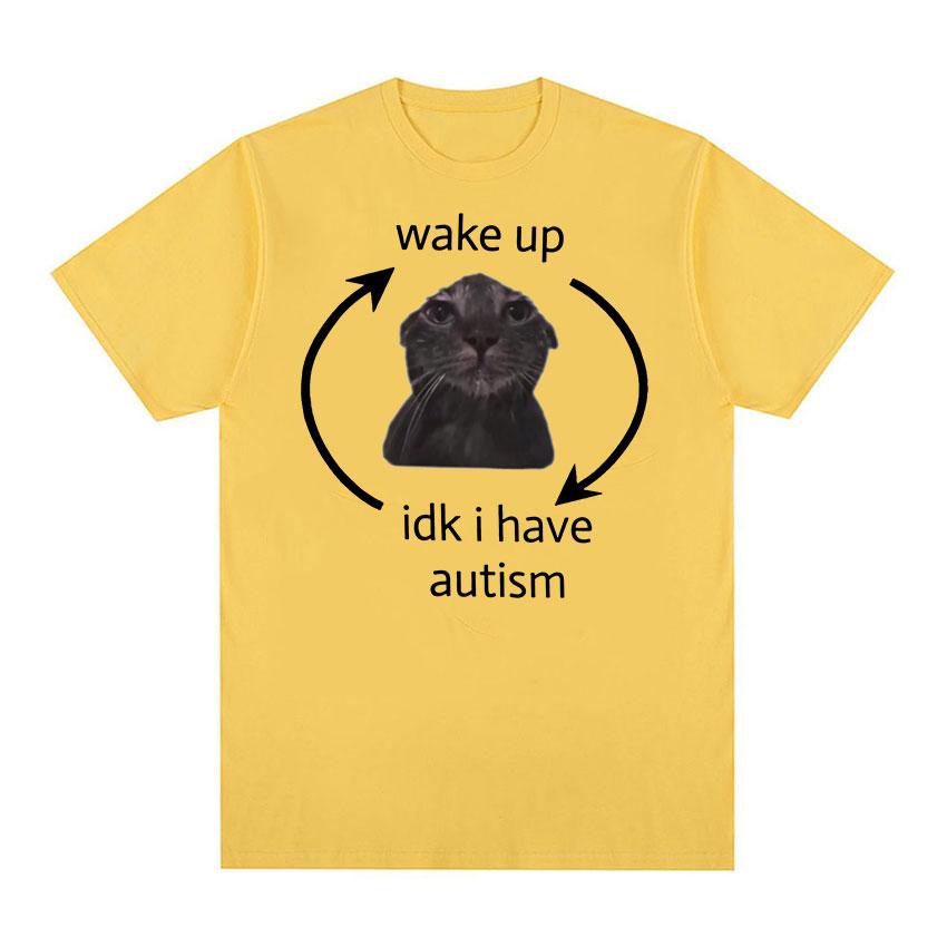 Просыпайся, я не знаю, у меня аутизм, кот, забавная футболка с мемами, мужская и женская ретро-модная футболка с коротким рукавом, повседневные хлопковые футболки большого размера