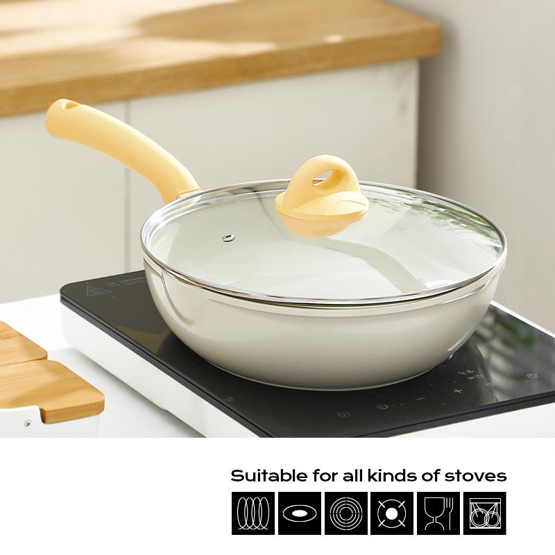 Прочная сковорода Вок-сковорода с крышкой 5 размеров Керамическая кастрюля с антипригарным покрытием Индукционная газовая плита Сковороды для омлета Сковорода для приготовления стейков Посуда для приготовления пищи 30cm жёлтый