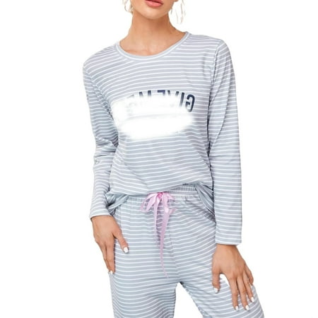 Women s Pajama Sets Light Grey Casual Slogan Round Neck Pant Sets Long Sleeve