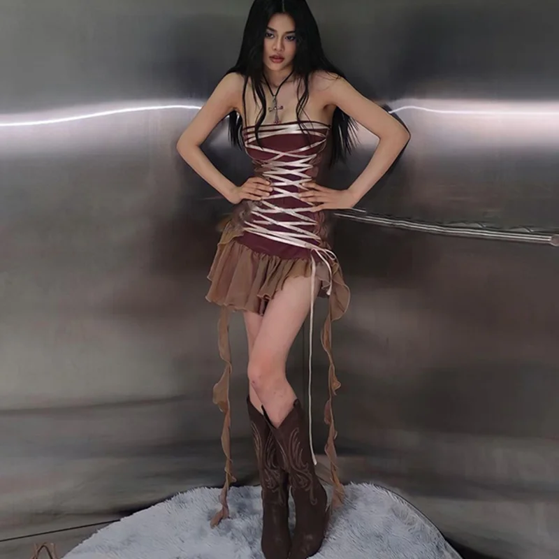 Fashion Women Dress Fresh Elegant Chic Solid Color Non-sleeve Drawstring Patchwork Pullover Japanese Style Ladies Leisure Dress