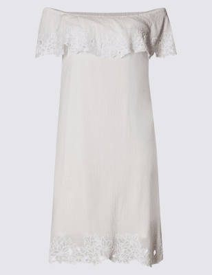 Прямое платье из чистого хлопка с открытым плечом и вышивкой