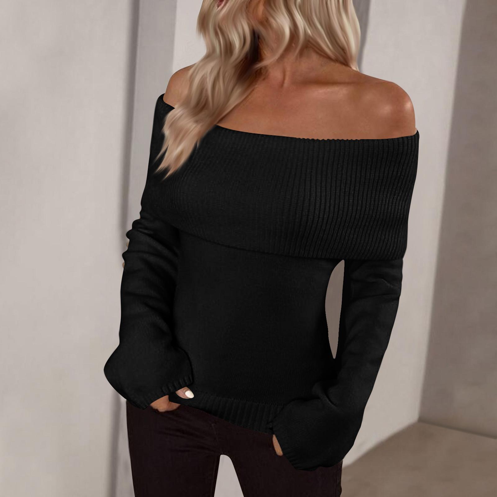 Пуловеры Джемперы Топы Женские С открытыми плечами Складной свитер Вязаные Осенние свитера XXL чёрный