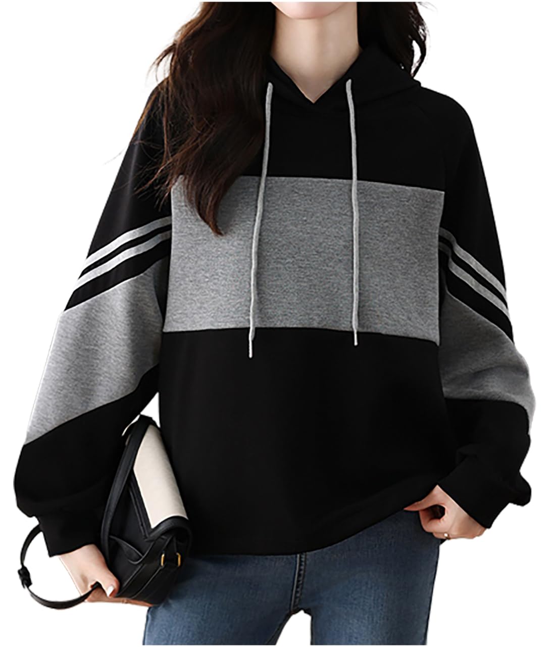 Пуловер Свободный Уличный Для беременных Корейский Приталенный и После Черный и Серый M.Luce Женское Двухцветное Худи, Топ, Толстовка, Весна, Осень, Зима, чёрный