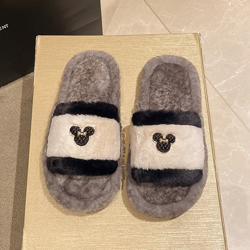 Пушистые женские тапочки, домашняя роскошная дизайнерская зимняя женская обувь с героями мультфильмов, элегантная домашняя обувь на плоской подошве, шлепанцы из нечеткого меха, новинка