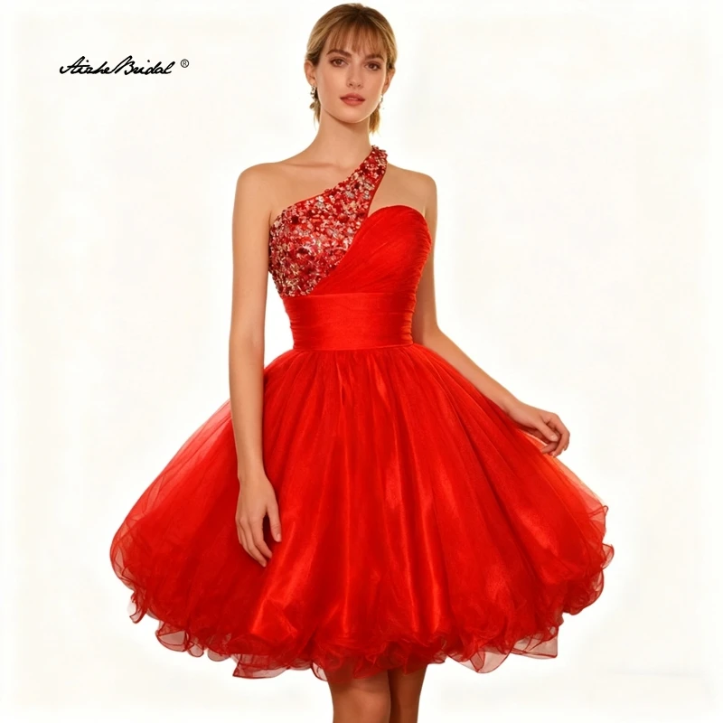 Пышная юбка Коктейльные платья Вечернее платье, бальное платье на одно плечо Короткие платья для выпускного вечера из красного тюля